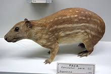 | Descripción Longitud de la cabeza y cuerpo 500-774mm, longitud de la cola 13-23mm, altura al hombro 270-310mm, peso 5-12kg. (Elizondo, 1999). Es grande y regordete, con el cuerpo en forma de cerdo. La parte dorsal es café rojizo, marcado con hileras de manchas de color. La parte ventral es de color blanco. Las patas son cortas, con 4 dedos en las patas delanteras y 5 dedos en las partes traseras (la huella trasera usualmente muestra 3 dedos 2 dedos externos muy pequeños). Ante el reflejo de la luz en los ojos, estos se tornan muy brillantes color anaranjado amarillento. Camada N1 cría. Alimentación Se alimentan de semillas, de plántulas y de “banano” Hábitat Bosques de galería, bosques húmedos, bosques secundarios viejos, cultivos de banano. Distribución geográfica Desde México hasta Bolivia y el sur de Brasil. | |