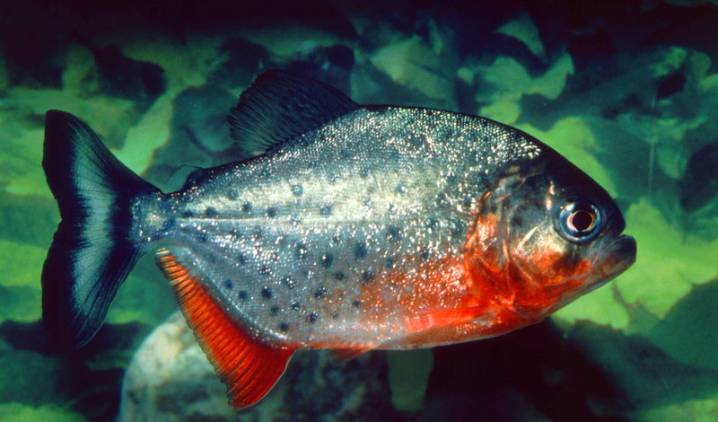 Las pirañas son famosas por devorar carne, desde pequeños insectos hasta mamíferos mucho más grandes que ellas, pero también se alimentan de semillas y otros materiales vegetales. De hecho, hay especies que son vegetarianas. Entre las omnívoras, destaca la piraña de vientre rojo siendo una de las más voraces e insaciables. En una investigación observaron que primero atacan a los ojos o a las colas de otros peces para inmovilizarlos, luego se los comen sin miramientos. Los dientes de las pirañas son como una hoja; afilados, puntiagudos y delgados ejercen una punción rápida seguida de un corte incisivo. Un cuchillo ideal para una dieta proteica. Además, músculos y mandíbulas les otorgan un mordisco formidable. Con relación a su peso, Serrasalmus rhombeus tiene una de las mordeduras más fuertes de entre todos los vertebrados. Asimismo sucedía con Megapiranha paranensis —un ancestro extinto de las pirañas de hace 10 millones de años— que ejercía una fuerza relativa superior a la del Tyrannosaurus rex.